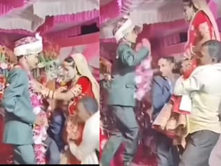 शादी के कई वीडियो लोग सिर्फ इसलिए बनाते हैं कि रील वायरल हो जाए. कुछ लोग तो इस मौके की ताक में रहते हैं कि कब कुछ मजेदार हो और उसकी वीडियो बना करशेयर कर दें. जिससे उनका वीडियो वायरल हो सके. बीते कुछ समय में शादी के वीडियो को लोग खूब पसंद कर रहे हैं और इस चक्कर में शादी के फेक वीडियो भी बनने लगे हैं. कई बार दूल्हा दुल्हन मिल कर भी ऐसे एक्ट कर जाते हैं जिससे उनका वीडियो वायरल हो सके. पर हमें एक अनूठा वीडियो मिला है जिसमें दूल्हन के रिश्तेदार दूल्हे के लिए जयामाला डालना मुश्किल बना रहे थे., लेकिन दूल्हे ने भी ऐसी मजबूत इच्छा शक्ति दिखाई कि वे दुल्हन समेत जमीन पर आ गए.