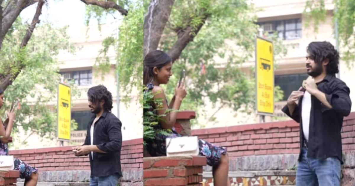 वीडियो में एक लड़का एक लड़की के पास आकर अपना मोबाइल देते हुए कहता है, “मैडम जरा वीडियो बना देना. यहीं से बैठकर बना दो” इसके बाद लड़की मोबाइल पर वीडियो बनाने लगती है और लड़का पहले पूछता है, “अच्छा ये बताओ गरीब तो लग रहा हूं ना मैं?” इस पर लड़की कहती है, “हां, गरीब लग रहे हो.”  इसके बाद लड़का सिर के बाल झटक कर कहता है, “अब लग रिया होंगा. अरे औजार तो निकाल लूं अपने” इसके बाद वह जेब से पत्थर निकालता है.