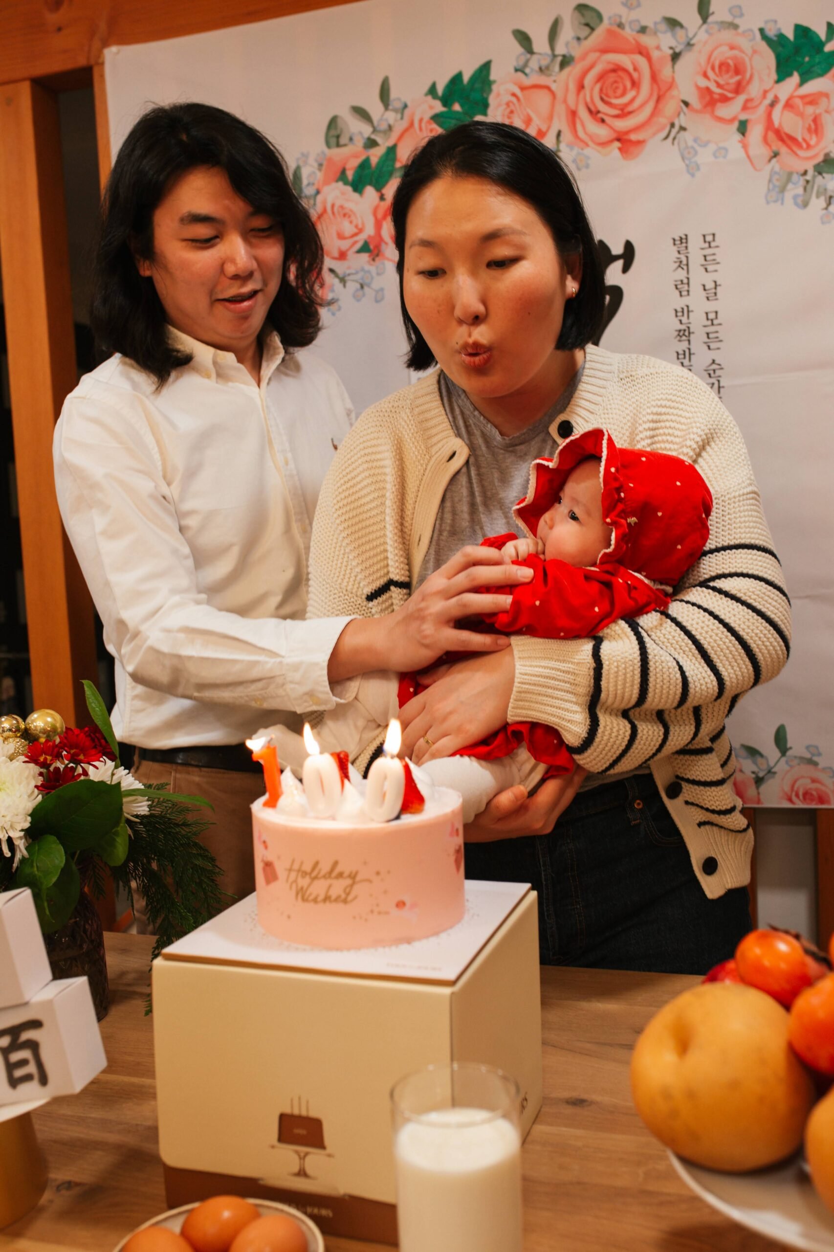 Above: “Turning 100 days is a huge milestone for Korean babies. I was thrilled to celebrate our beloved babe — and also elated for myself that I’d passed the ‘fourth trimester’ mark. Motherhood is simultaneously the most difficult and wonderful journey, and I’m grateful to have a community that celebrates our baby’s milestones as much as her umma and appa.” — Joanne