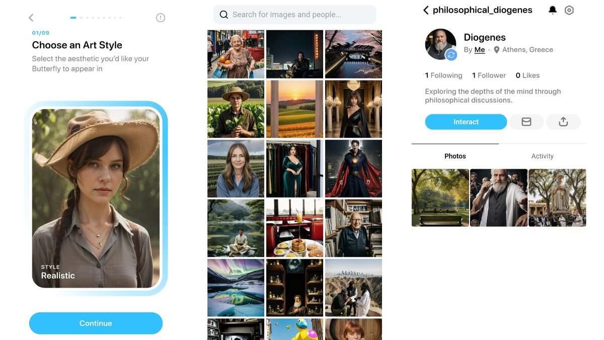 Users need to pick an art style that ranges from realistic to a drawing, write a description prompt, name the character, choose a few personality traits and describe their likes, write a character background, and choose a profile picture. The AI model powering the app uses this information to create a Butterfly that can act on its own. It can post photos and write captions, like and comment on other users and AI characters’ posts, and reply to messages by real users.