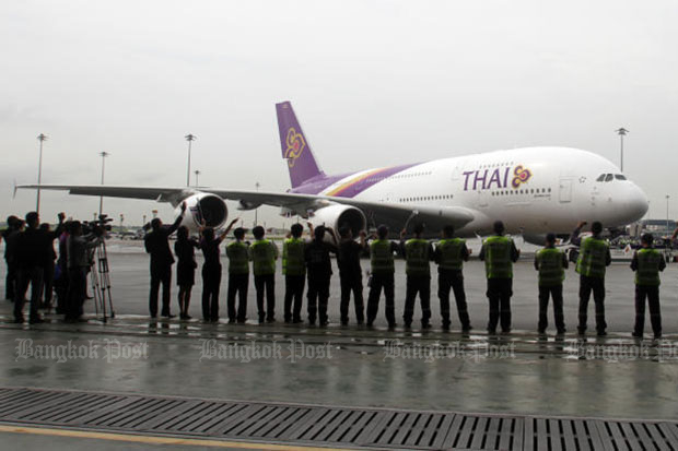 Read moreThai Airways International staff gather around the airline’s first super jumbo Airbus A380-800, named ‘Srirattana’, upon its arrival at Suvarnabhumi