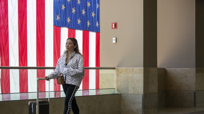 Read moreA passenger passes a giant American flag as they make their way to and from their gates during the Memorial