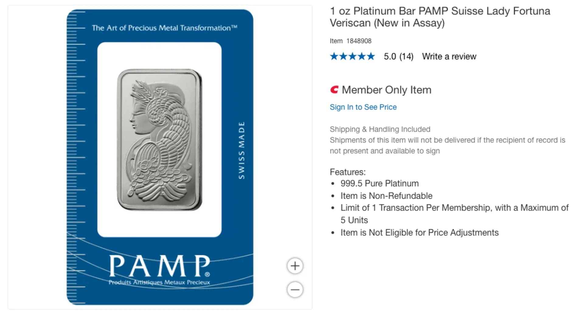 Costco on Wednesday announced the 1-ounce platinum bars, on sale for $1,089.99 on its website alongside its now-famed gold bars and silver coins. The bars are only sold online, and cannot be delivered to Louisiana, Nevada or Puerto Rico, the company said. Interested buyers will also need a Costco membership, which costs between $65 and $130 a year.