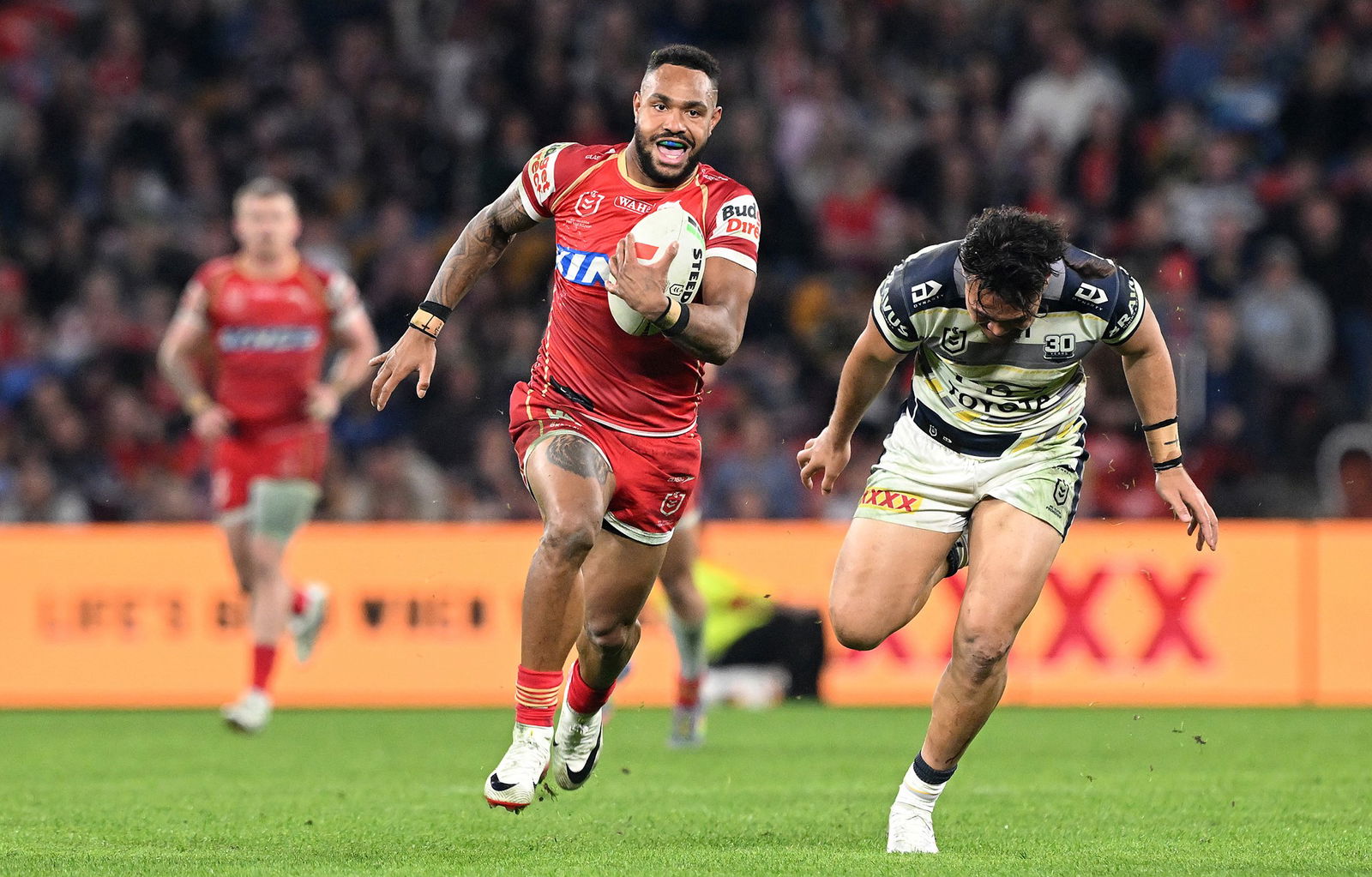 Three of the Dolphins’ four tries have come from their own half, entertaining this good crowd at Lang Park.