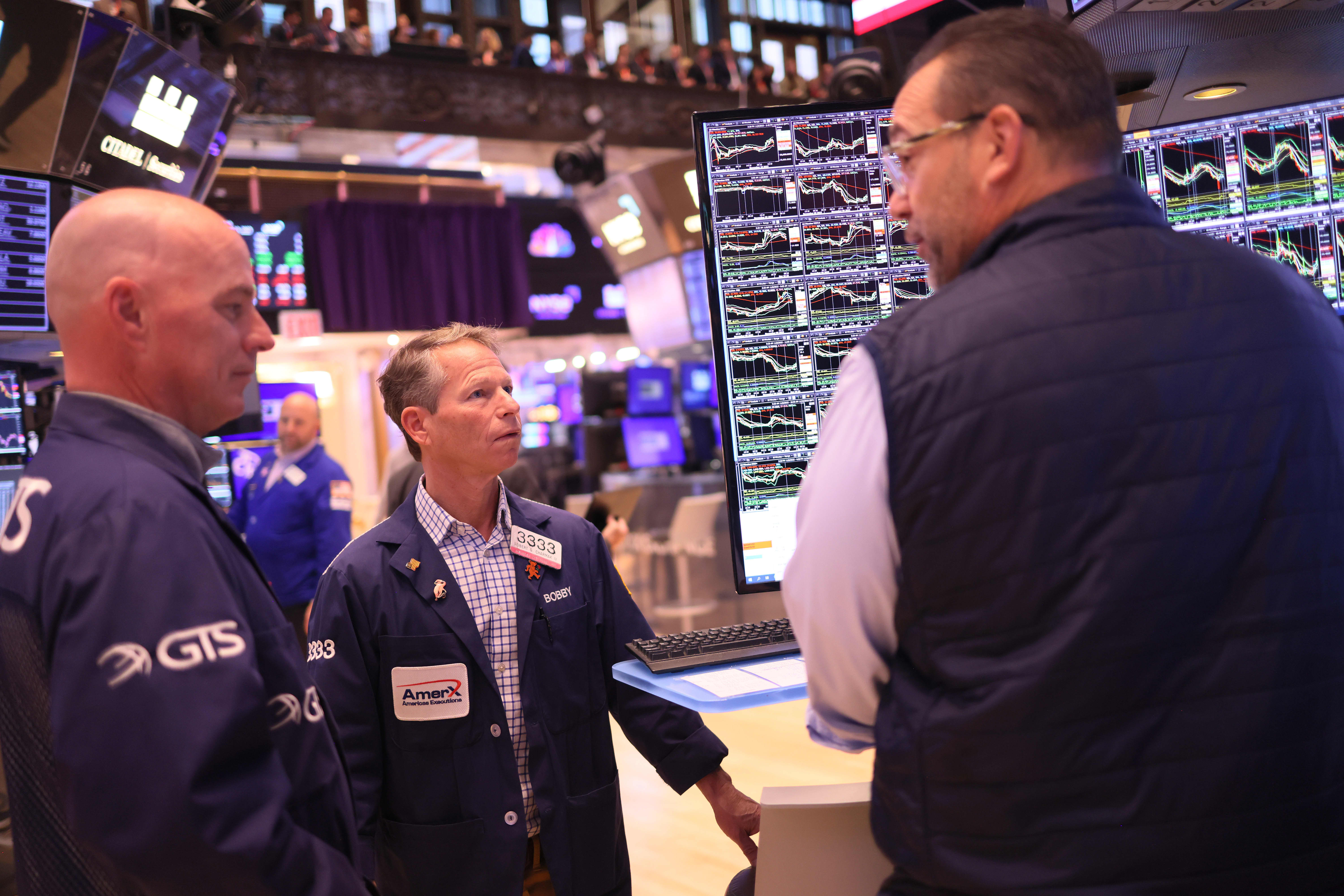 Traders work on the floor of the New York Stock exchange during morning trading on November 10, 2023 in New York City.