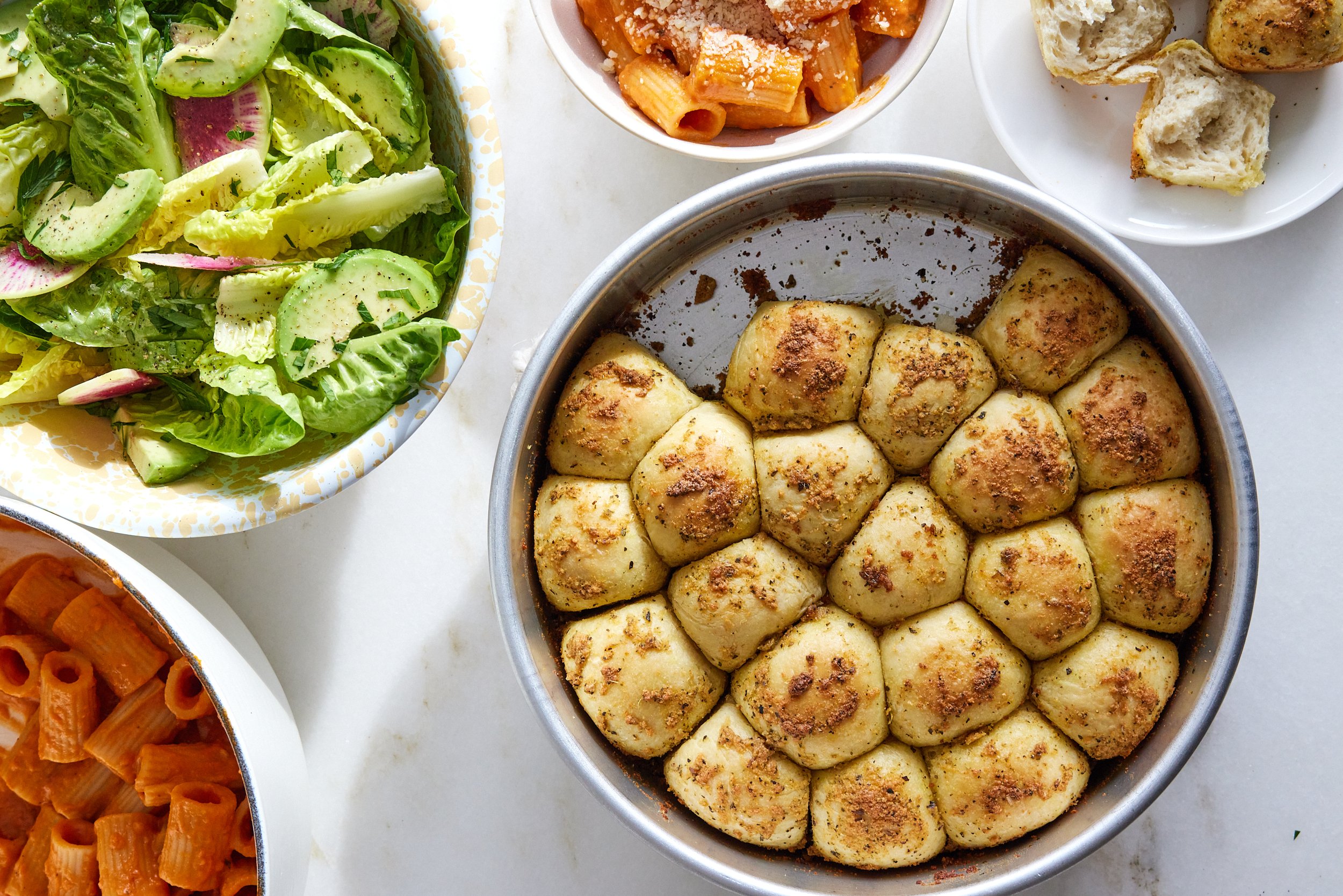 The end result? A big tray of warm, soft garlic rolls. We wolfed them up, and our neighbors, who came over for dinner, loved them, too. Such an easy, comforting addition to the table, and I’m excited to make these kits a ritual.