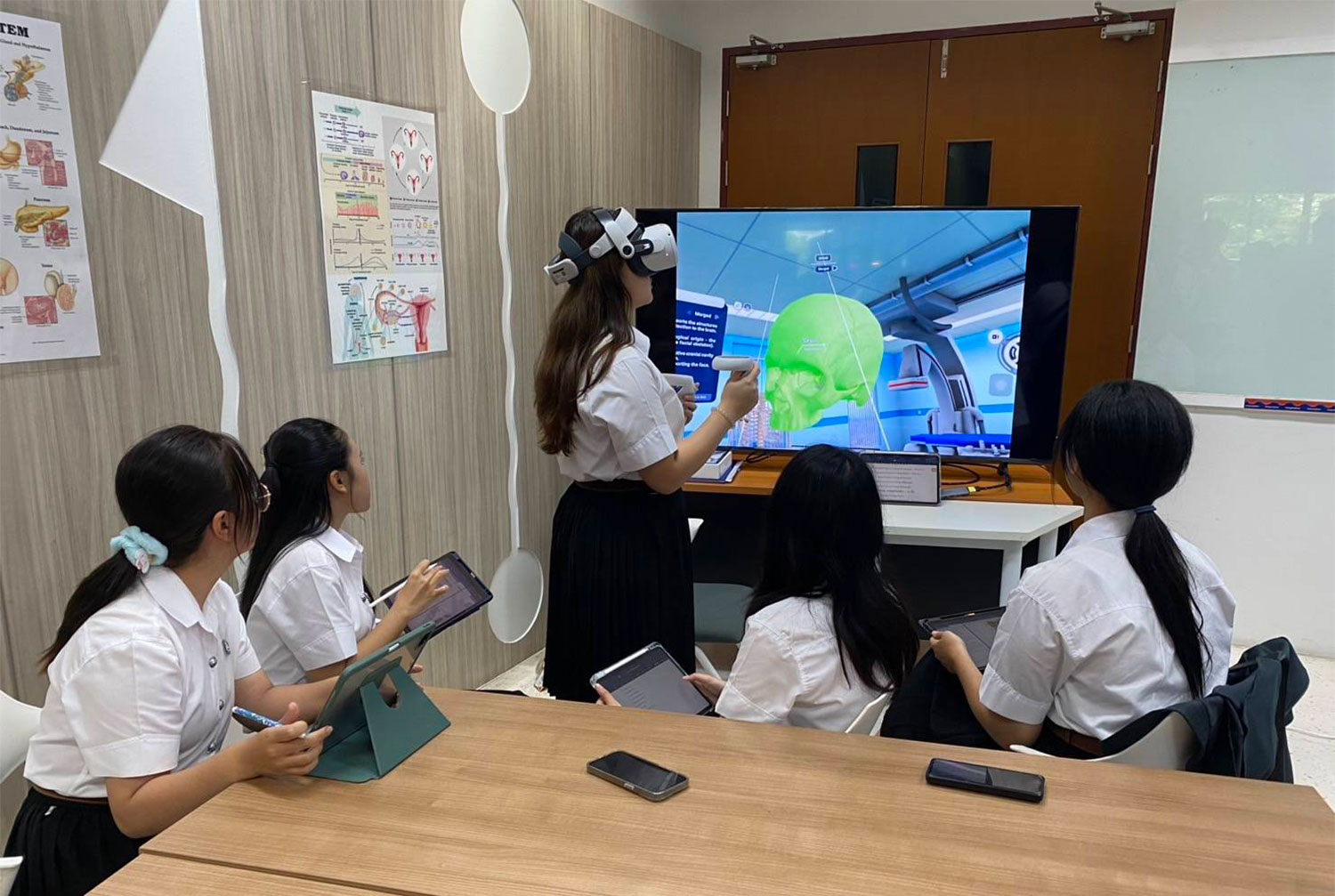 A nursing student wears a virtual reality headset as her classmates look on during one of the classes in the Innovative Nursing major programme at King Mongkut’s Institute of Technology Ladkrabang (KMITL) in Bangkok. (Photo: Pitchayangkul Wongjanakool)