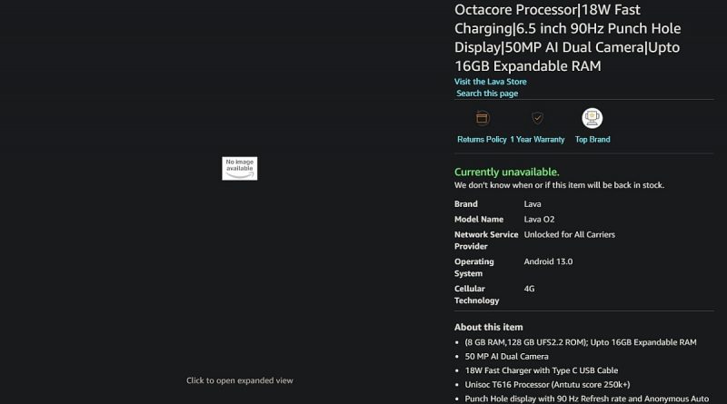 The Amazon listing for the Lava O2 also states that the phone will be powered by an octa-core Unisoc T616 chip paired with 8GB of LPDDR4x RAM and 128GB of UFS 2.2 storage. It is claimed to score over 250,000 points in the AnTuTu benchmark test.