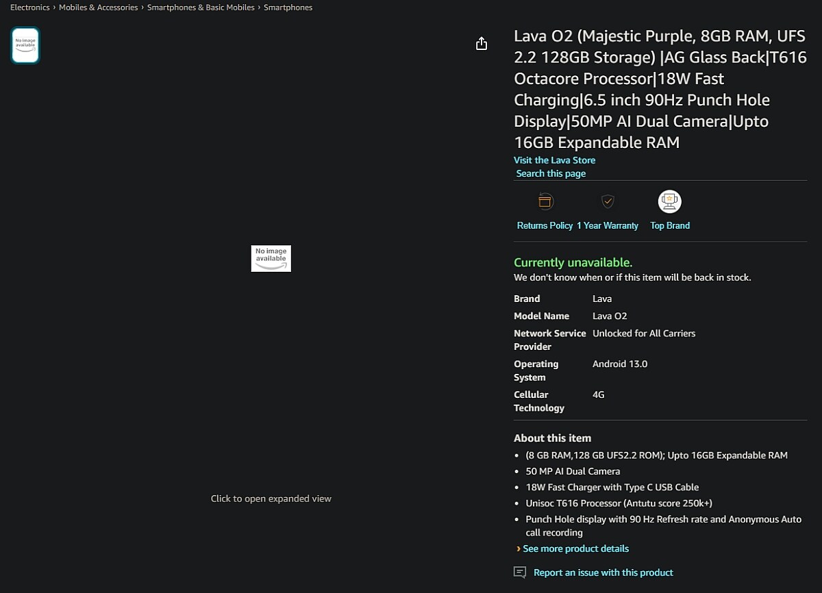 The Amazon listing for the Lava O2 also states that the phone will be powered by an octa-core Unisoc T616 chip paired with 8GB of LPDDR4x RAM and 128GB of UFS 2.2 storage. It is claimed to score over 250,000 points in the AnTuTu benchmark test.