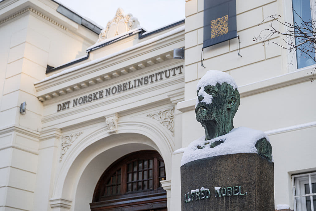 A bust of Swedish chemist, engineer, inventor, businessman, and philanthropist Alfred Nobel (1833-1896) is pictured outside the Norwegian Nobel Institute in Oslo, Norway on January 8, 2026.