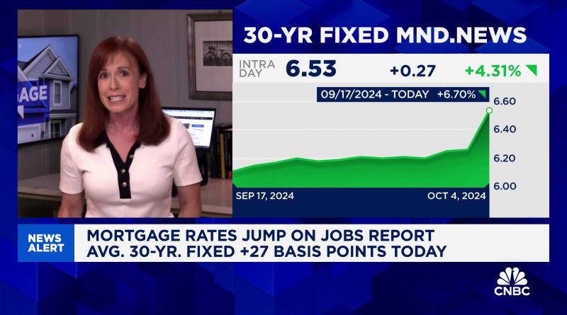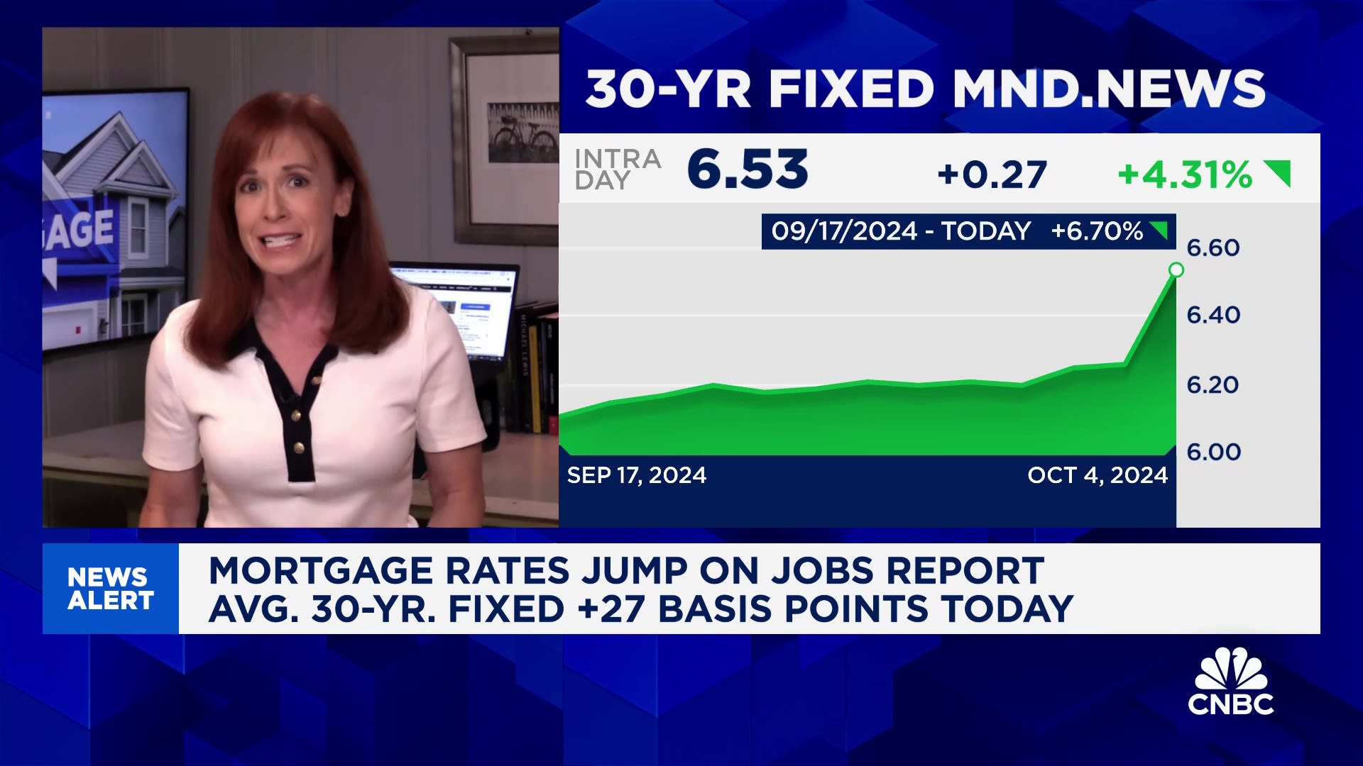 The average rate on the 30-year-fixed mortgage jumped 27 basis points Friday morning following the release of the government’s monthly employment report. The rate is now 6.53%, according to Mortgage News Daily.