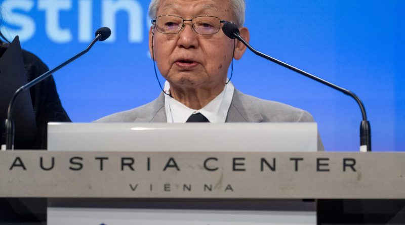 Japan’s 82-years old nuclear survivor Kido Suechi of “Nihon Hidankyo” (Japan confederation of A and H bomb sufferers Organization) speaks during the 2022 Vienna Conference on the Humanitarian Impact of Nuclear Weapons at the Austrian Center in Vienna, Austria on June 20, 2022.