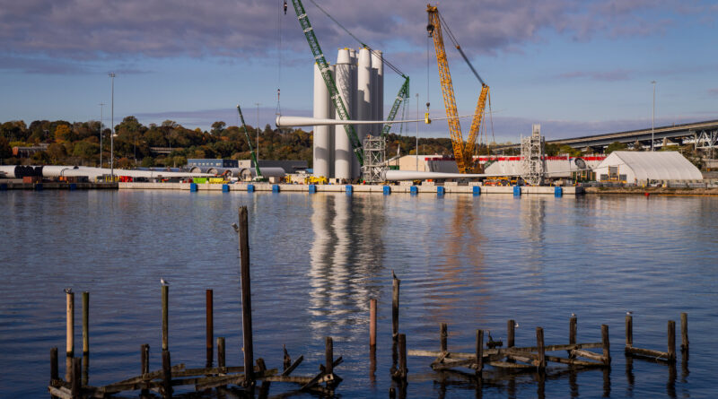 A turbine blade is lifted onto a rack near tower sections at the Revolution Wind project assembly site at State Pier in New London, Connecticut, US, on Friday, Oct. 24, 2025.