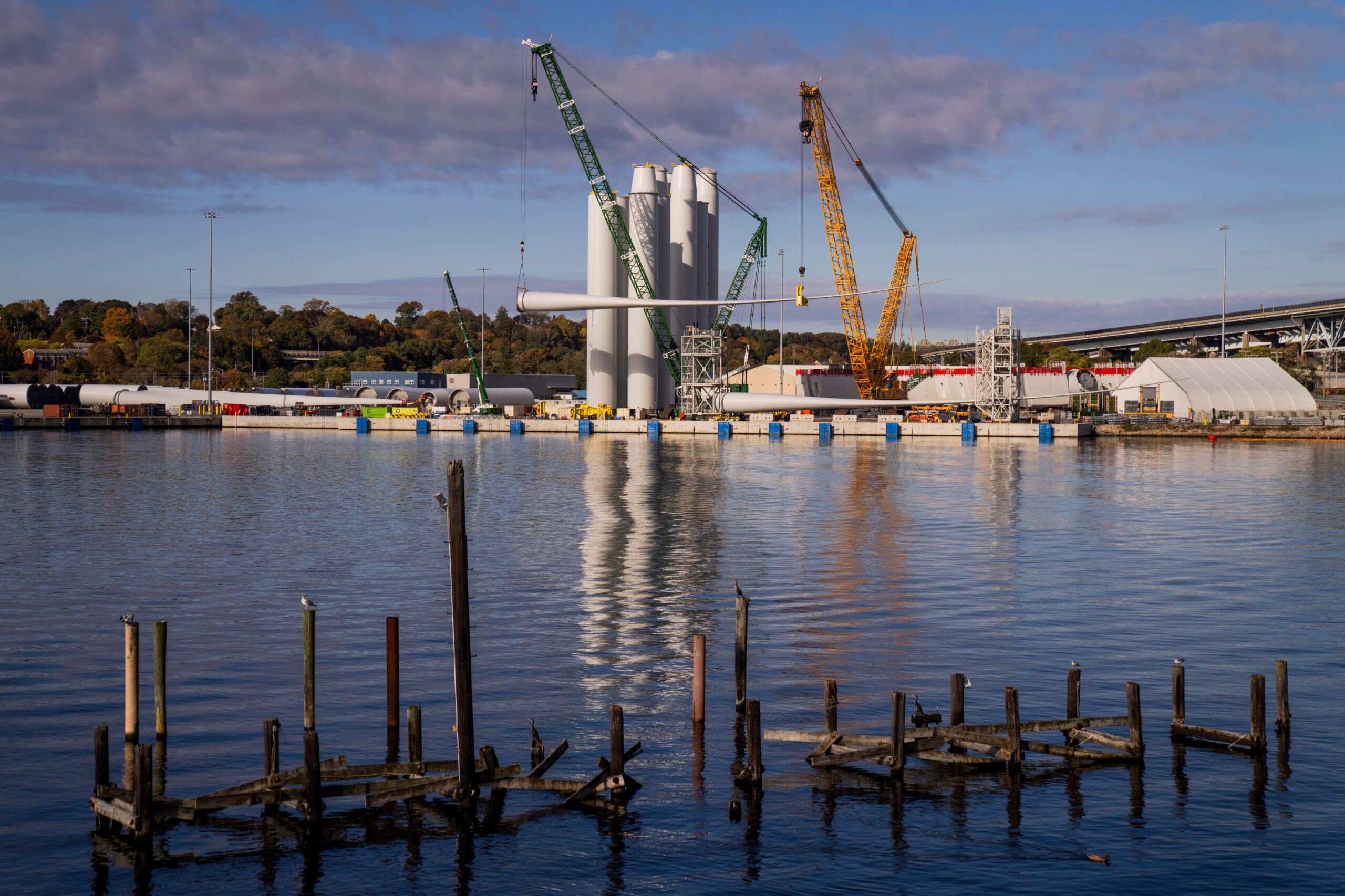 A turbine blade is lifted onto a rack near tower sections at the Revolution Wind project assembly site at State Pier in New London, Connecticut, US, on Friday, Oct. 24, 2025.