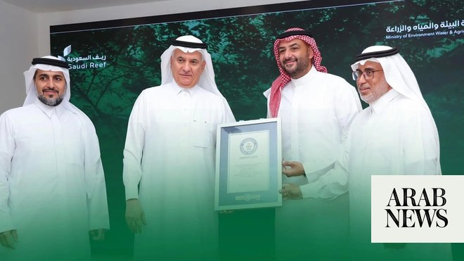 Minister of Environment, Water and Agriculture Abdulrahman Al-Fadhli received the registration certificate from the Guinness World Records during a ceremony held by the Saudi Reef Program at its headquarters in Riyadh. Deputy Minister of Environment, Water and Agriculture Mansour Al-Mushaiti, Secretary-General of the Reef Program Ghassan Bakri and other ministry staff attended the ceremony.
