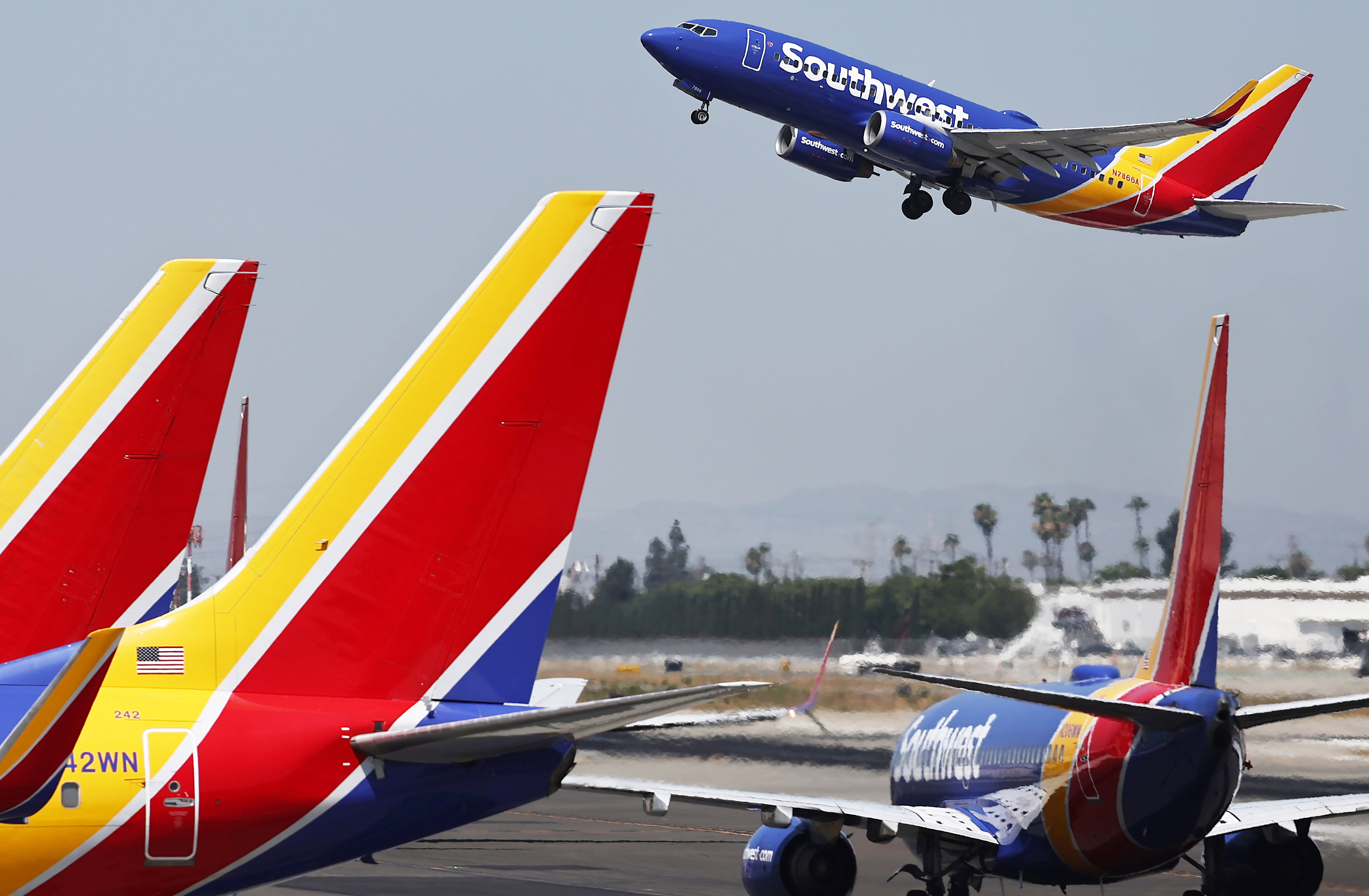 A Southwest Airlines plane takes off from Hollywood Burbank Airport above other Southwest planes on July 25, 2024 in Burbank, California.