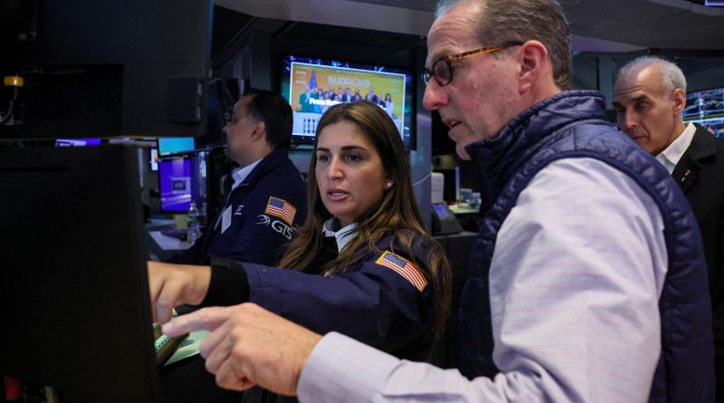 Traders work on the floor at the New York Stock Exchange on April 25, 2024.