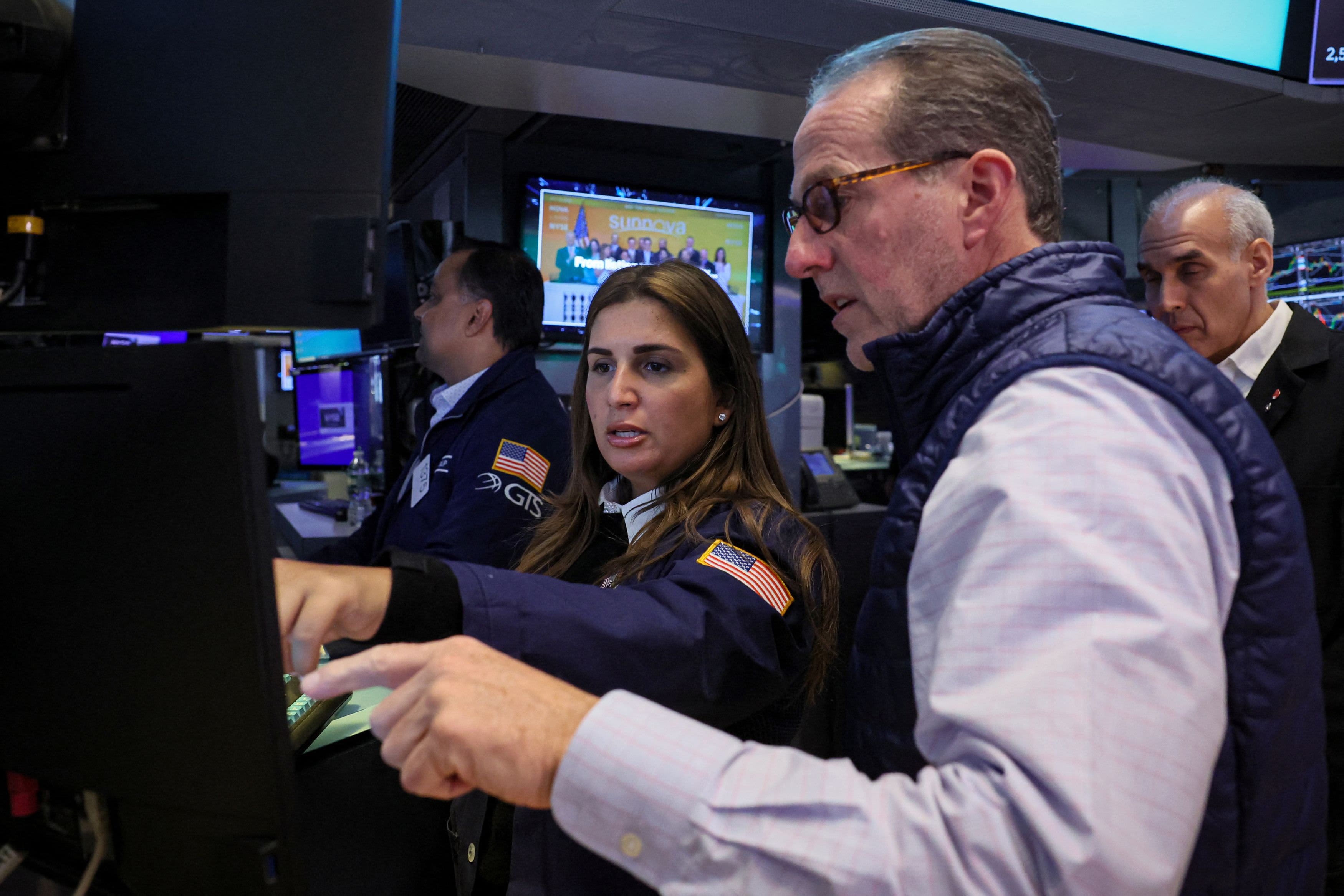 Traders work on the floor at the New York Stock Exchange on April 25, 2024.