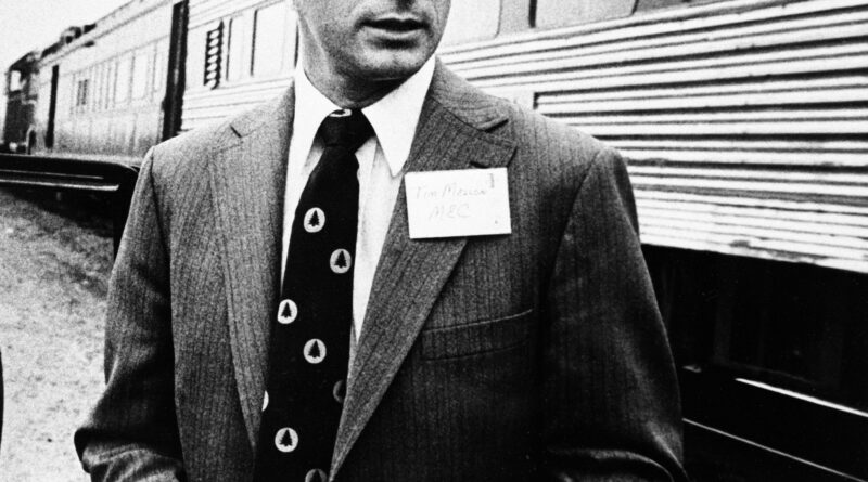 Timothy Mellon, seen outside an inspection train during a property tour in 1981. Exact date and location unknown.