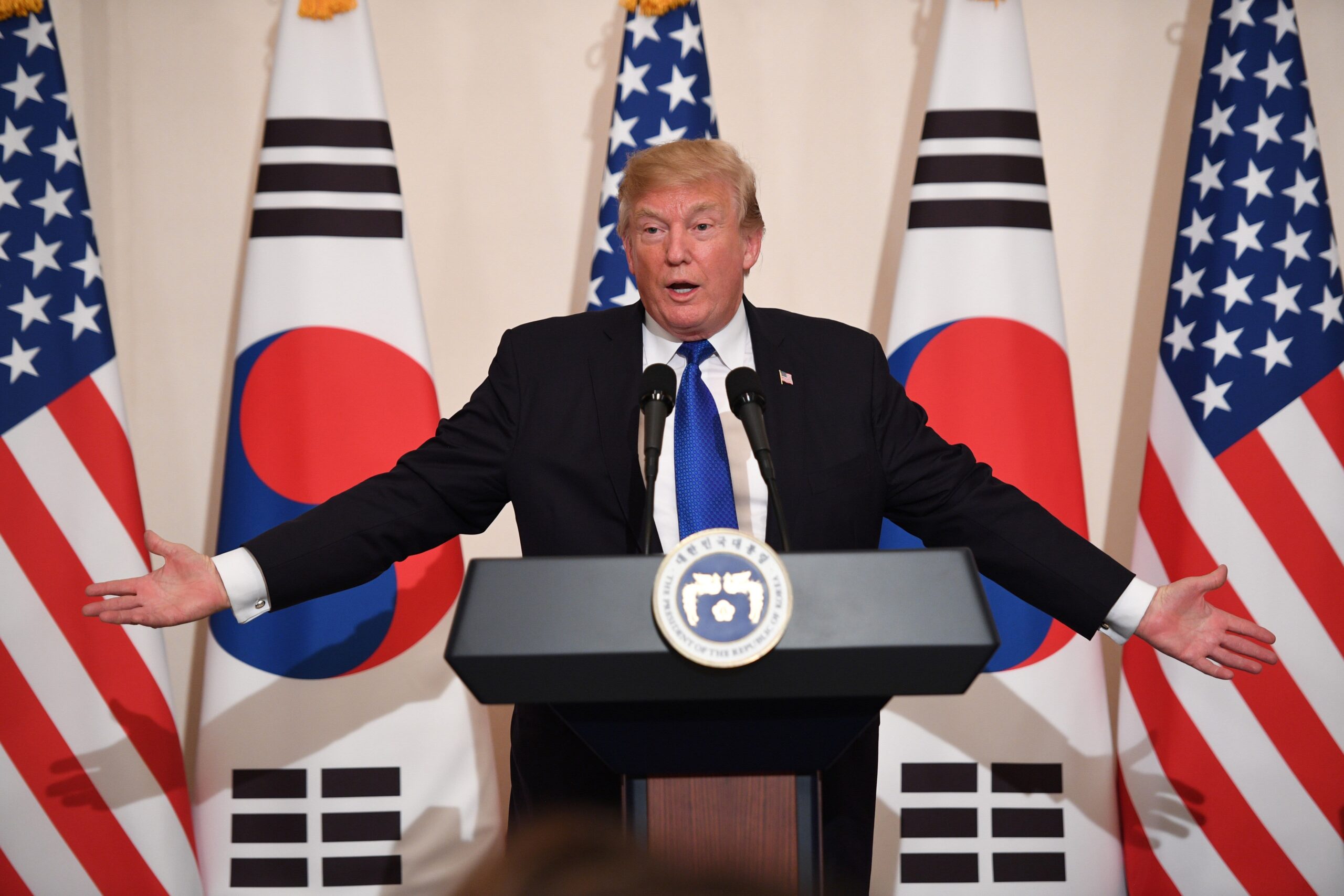 File photo: US President Donald Trump gestures during a joint press conference in South Korea.