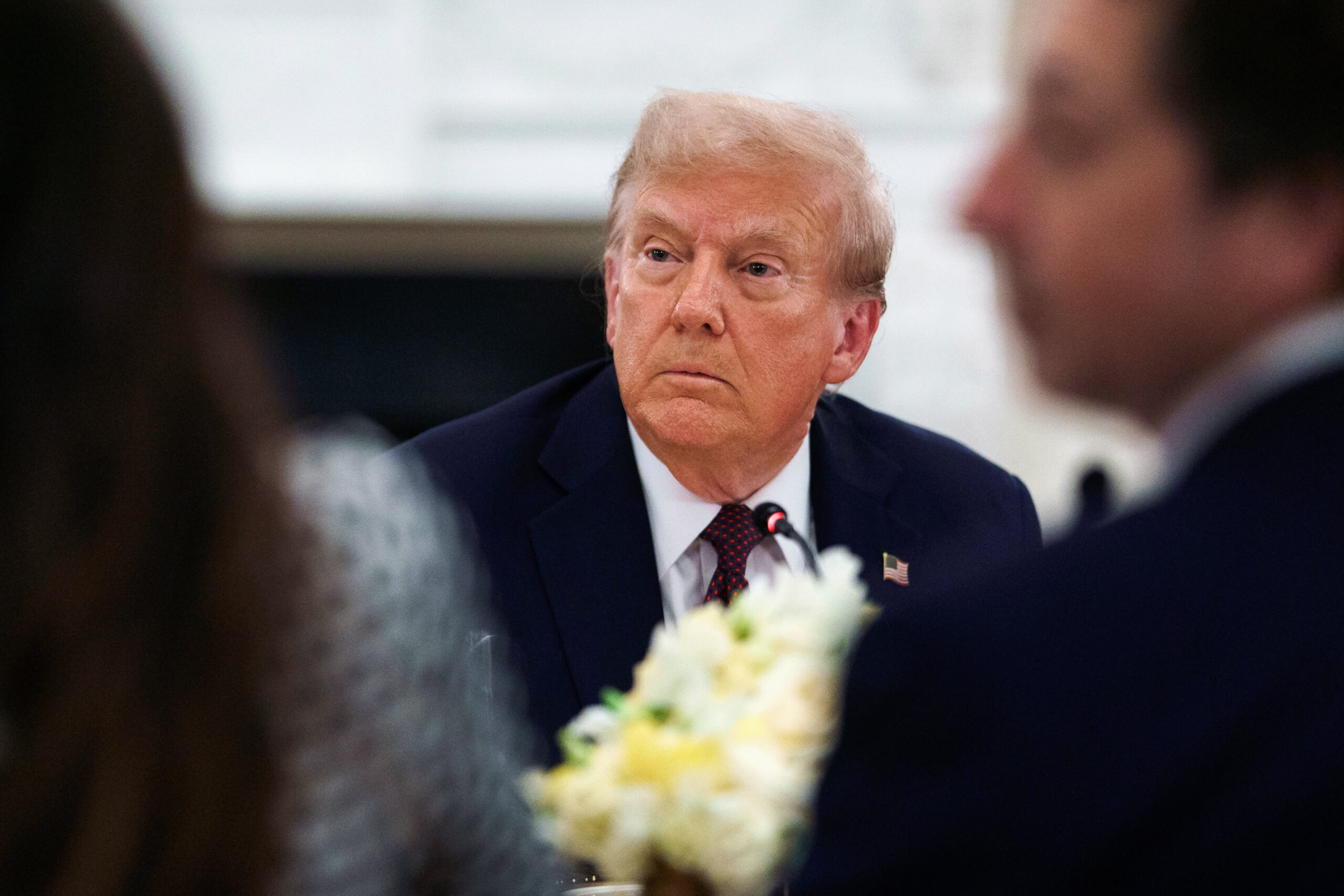 US President Donald Trump during a dinner with tech leaders in the State Dining Room of the White House in Washington, DC, US, on Thursday, Sept. 4, 2025.