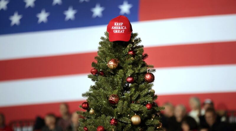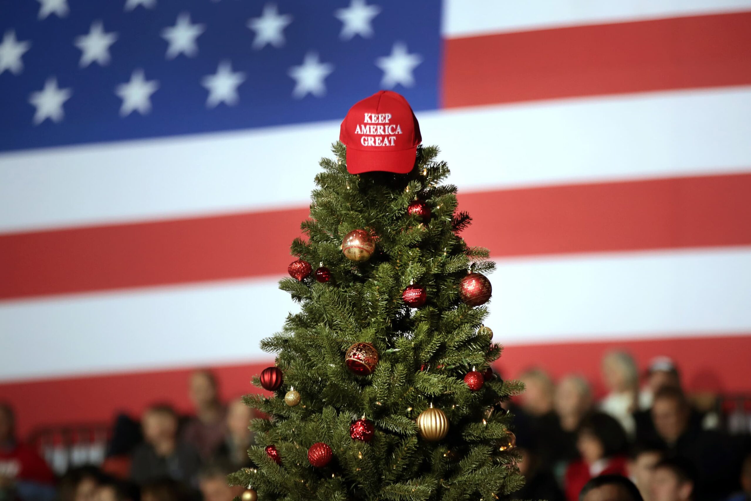 A “Keep America Great” hat tops off a Christmas tree at a “Merry Christmas” rally hosted by President Donald Trump at the Kellogg Arena in Battle Creek, Michigan, Dec. 18, 2019.