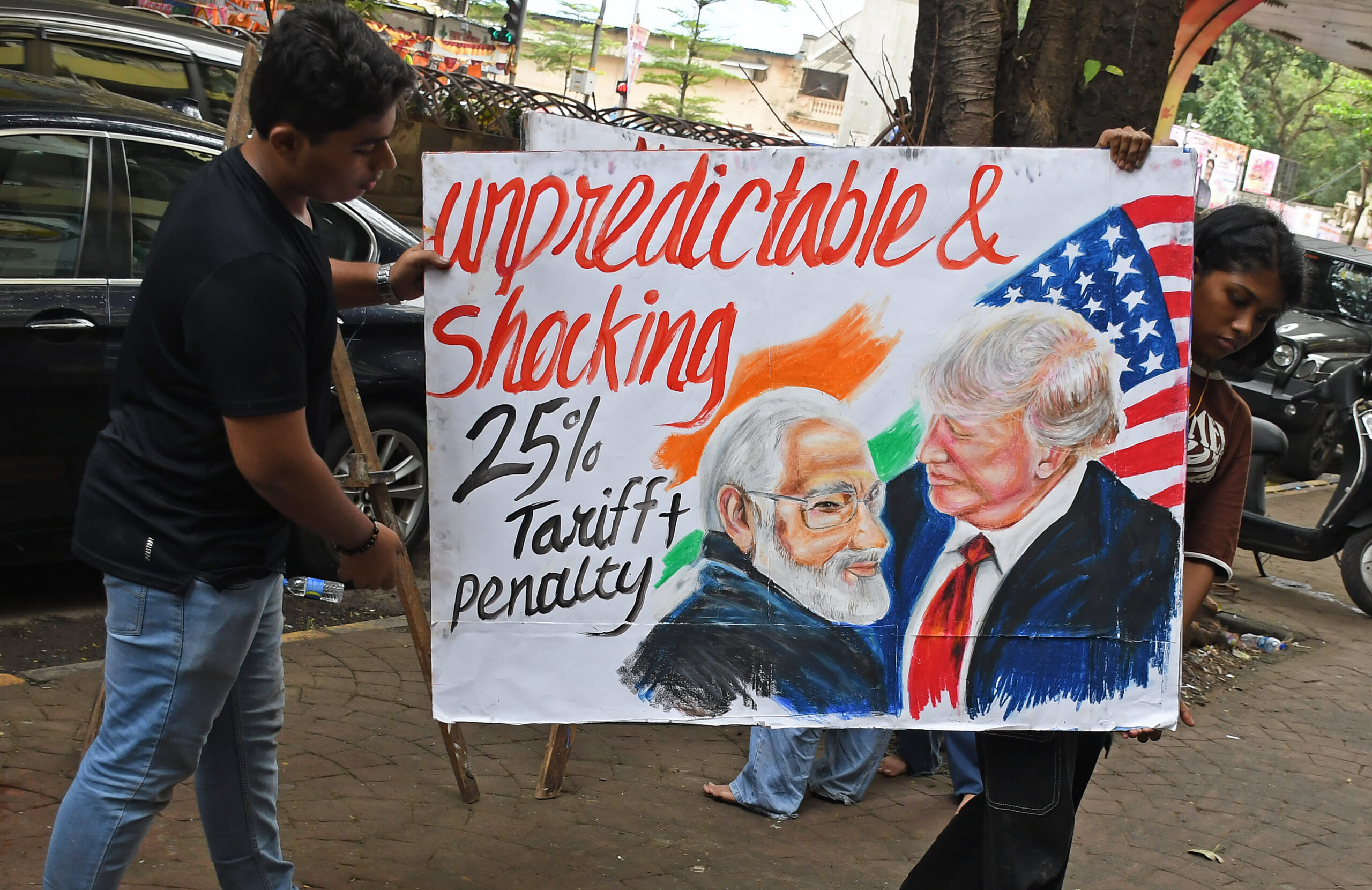 Students from Gurukul School of Art, carry a poster of Prime Minister of India Narendra Modi and U.S. President Donald Trump on India outside their school. U.S. President Donald Trump imposed a 25% tariff on India along with penalties for buying oil and military equipments from Russia.