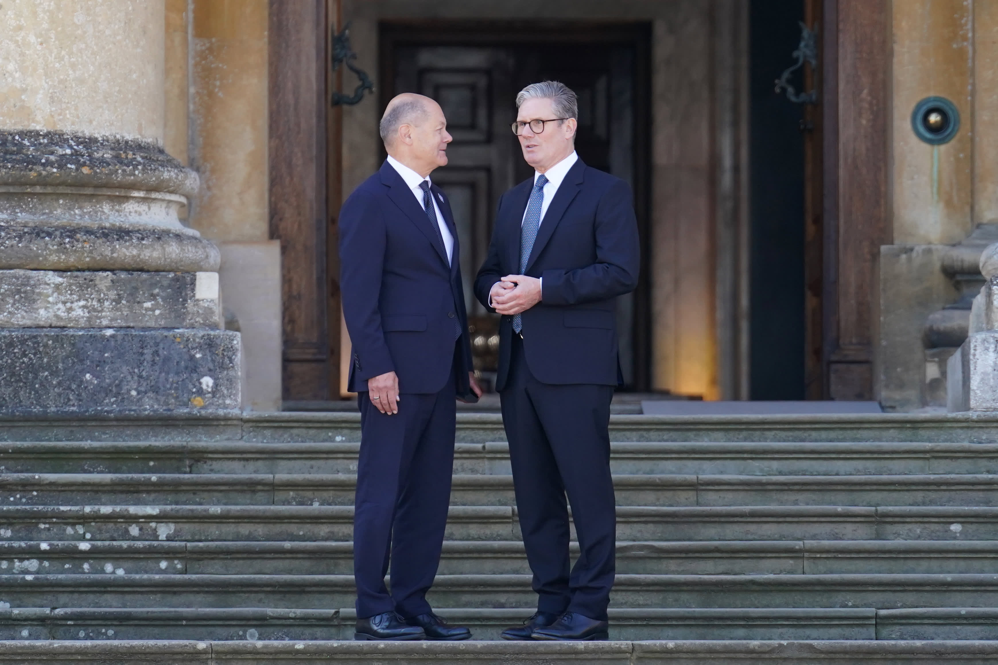Chancellor of Germany Olaf Scholz (L) is welcomed by Britain’s Prime Minister Keir Starmer to the European Political Community summit at Blenheim Palace on July 18, 2024 in Woodstock, England.