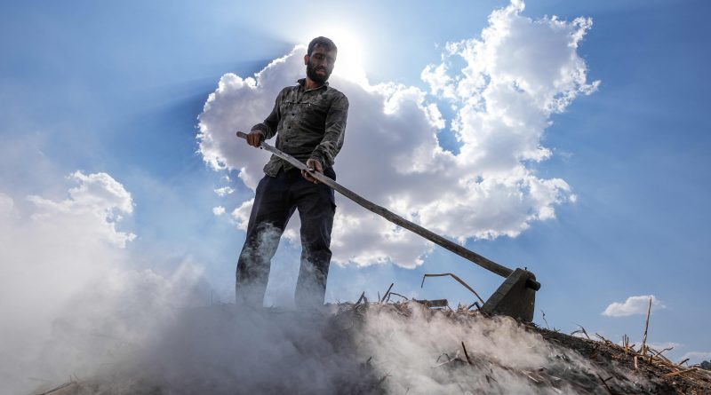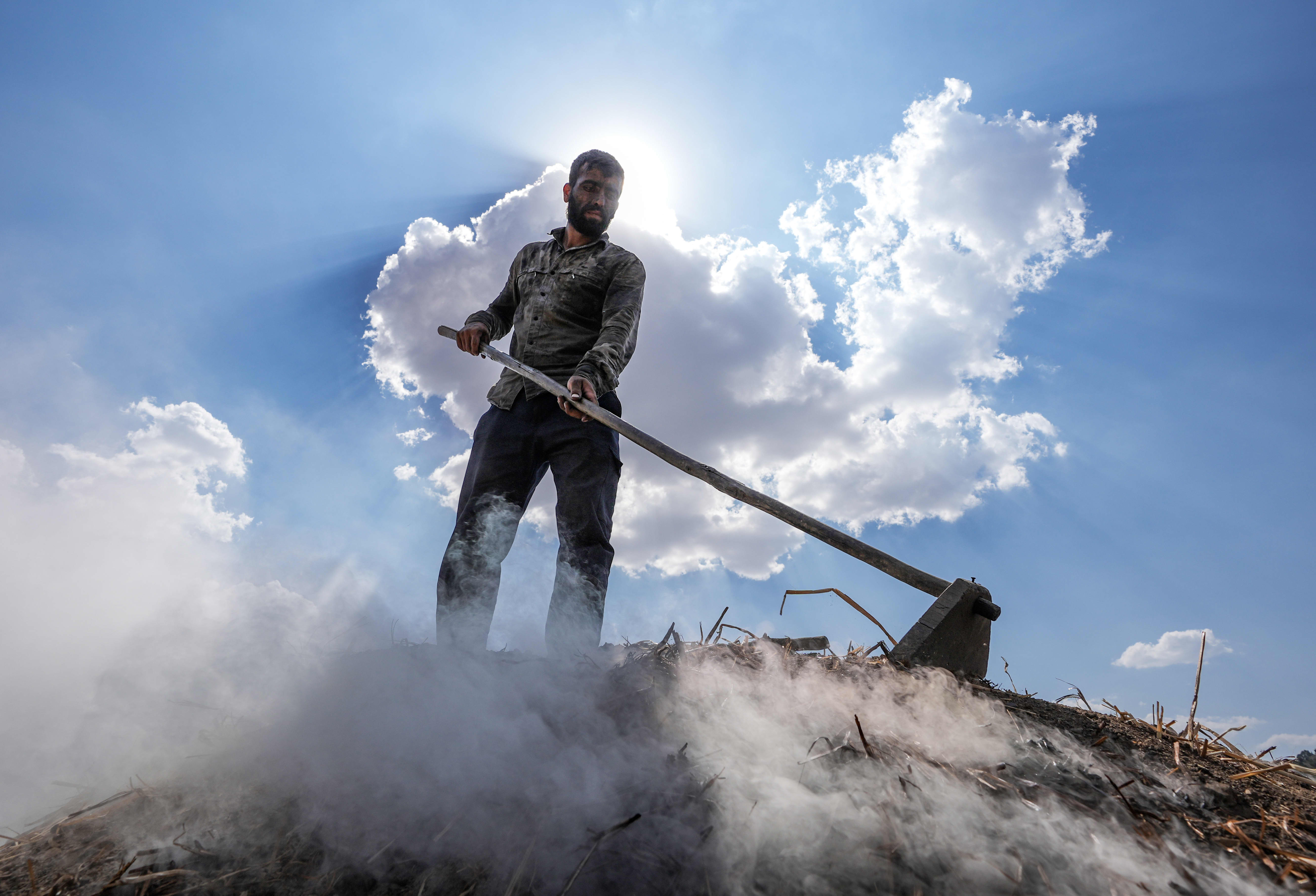 A worker, called ‘torchers’, works in a charcoal production during scorching heat exceeding 40 degrees Celsius in Diyarbakir, Turkiye on July 18, 2024.