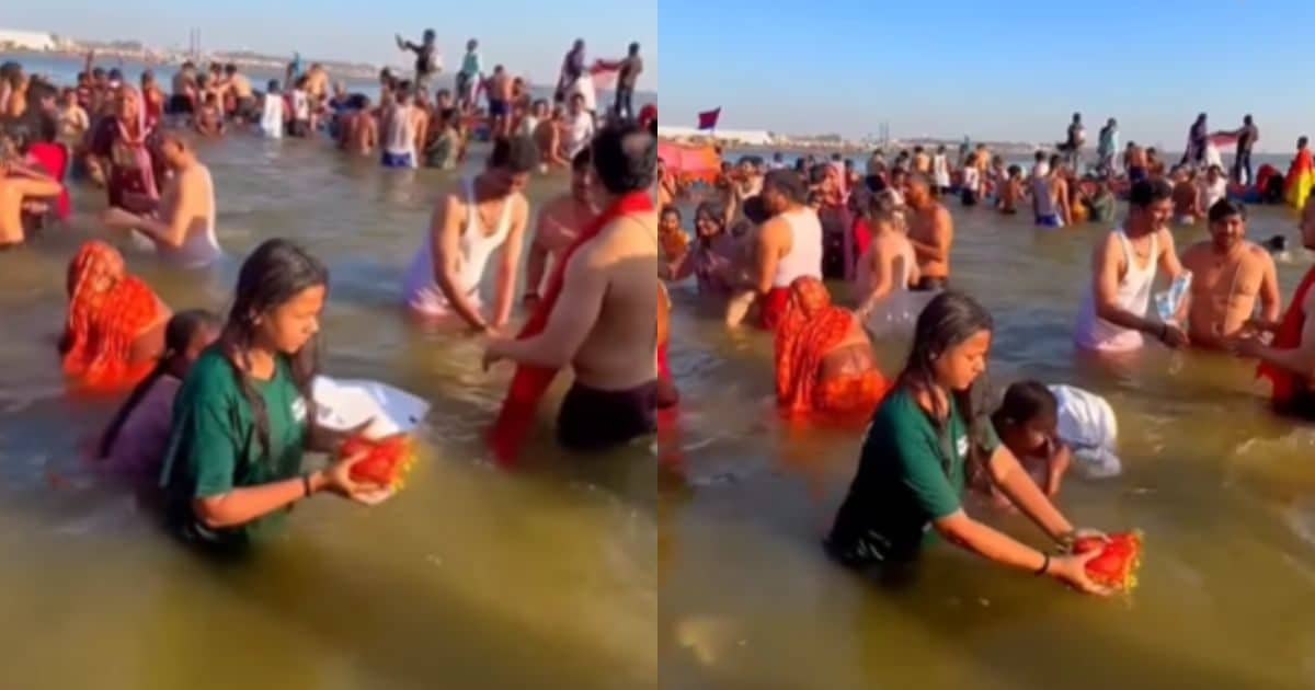वीडियो में हम देखते हैं कि गंगाजी के एक घाट पर कुछ भीड़ है. बहुत से लोग डुबकी लगाने पहुंचे हैं. एक लड़की भी नारियल और कपड़ा लेकर गंगाजी को अर्पित करने घाट के पानी में उतरती है. उसके आगे एक महिला एकसफेद रंग का बोरा घसीटते हुए पानी में बढ़ रही होती है. वहीं यह लड़की भी खुद को सम्भालते हुए आगे बढ़ती है और एक बारतो उसी महिला को पकड़ भी लेती है.