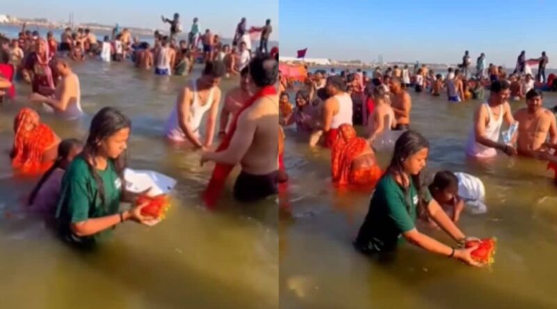 वीडियो में हम देखते हैं कि गंगाजी के एक घाट पर कुछ भीड़ है. बहुत से लोग डुबकी लगाने पहुंचे हैं. एक लड़की भी नारियल और कपड़ा लेकर गंगाजी को अर्पित करने घाट के पानी में उतरती है. उसके आगे एक महिला एकसफेद रंग का बोरा घसीटते हुए पानी में बढ़ रही होती है. वहीं यह लड़की भी खुद को सम्भालते हुए आगे बढ़ती है और एक बारतो उसी महिला को पकड़ भी लेती है.
