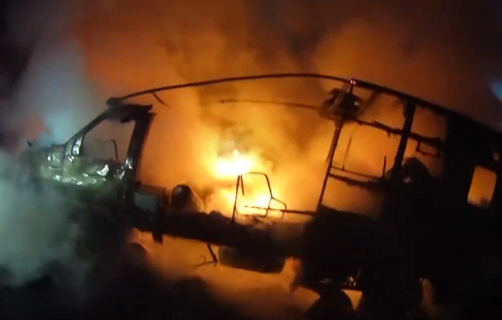 A video posted by the fire department shows a destroyed vehicle, with flames continuing to burn items inside. Firefighters pried part of the home open with an axe to douse the inside with water, the video shows.