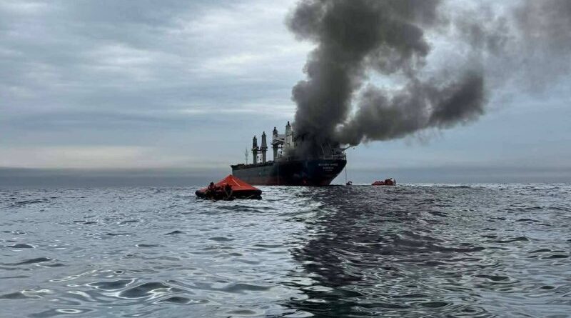 Smoke rises from the MV Mayuree Naree after it was struck by two Iranian missiles on March 11 in the Strait of Hormuz.