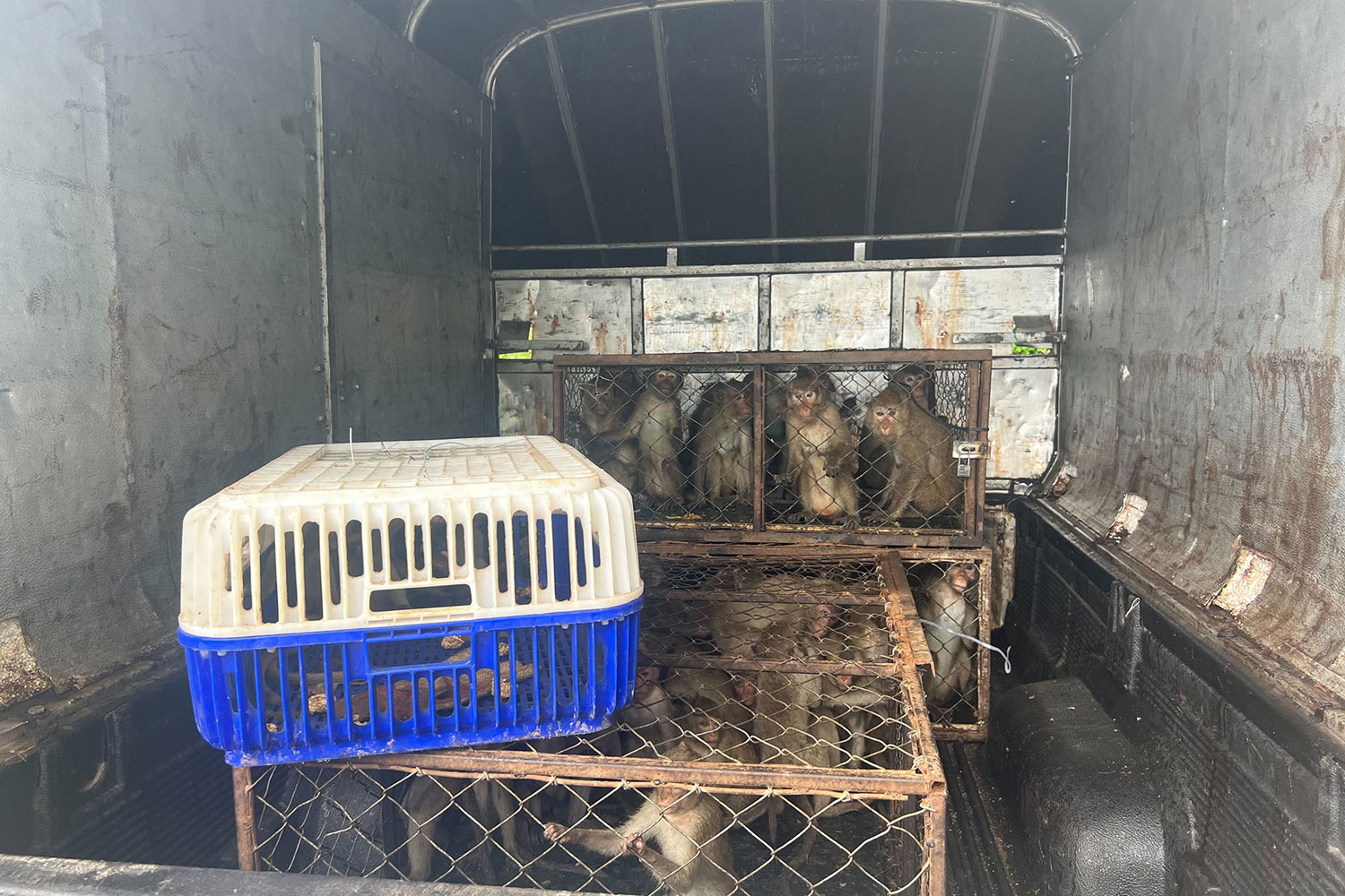 The patrol moved in to question the men, who immediately dropped everything and fled, abandoning the parked vehicle. They left behind three iron cages and one plastic cage containing a total of 62 live macaques.