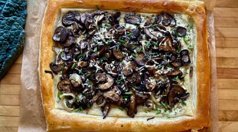 Scoop the mushroom-onion mixture on top, evenly dividing everything, then top with Parm. Bake for 20-25 minutes until pastry is golden and puffy and the mushrooms look shriveled. Serve warm or at room temperature.