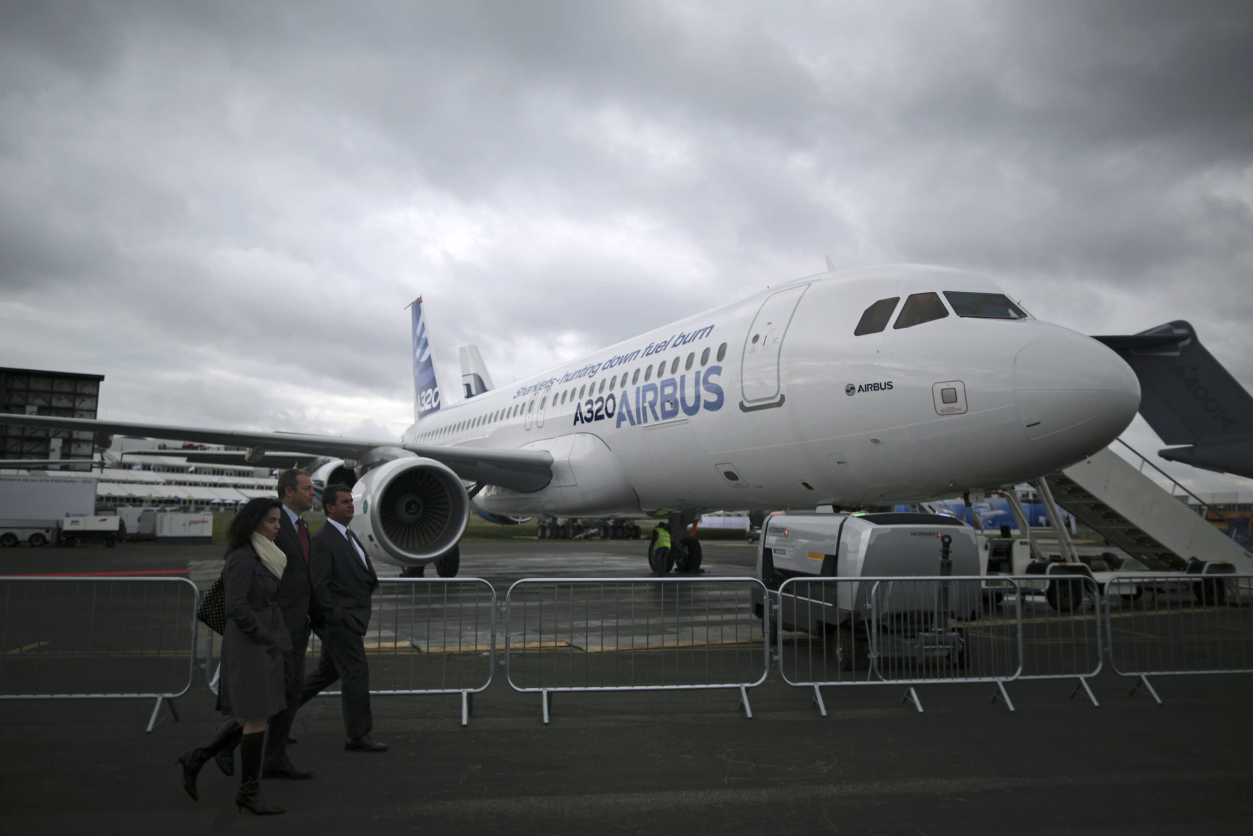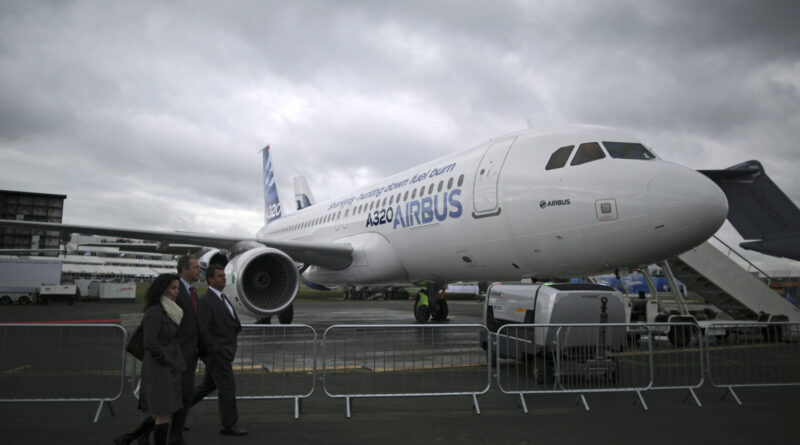 File: Visitors pass an Airbus SAS A320 aircraft on the second day of the Farnborough International Air Show in Farnborough, U.K., on Tuesday, July 10, 2012.