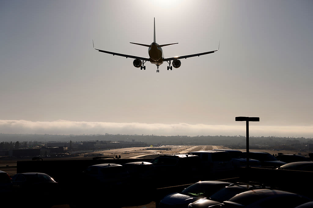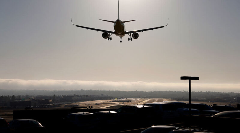 A Spirit Airlines Airbus A320 airplane approaches San Diego International Airport for a landing from Las Vegas on May 9, 2025 in San Diego, California.
