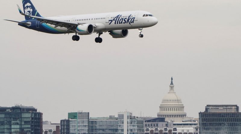 An Alaska Airlines aircraft flies past the U.S. Capitol before landing at Reagan National Airport in Arlington, Virginia, U.S., January 24, 2022.