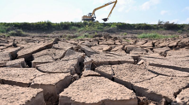 An excavator drives past a dried-up pond in Vietnam’s southern Ben Tre province on March 19, 2024.