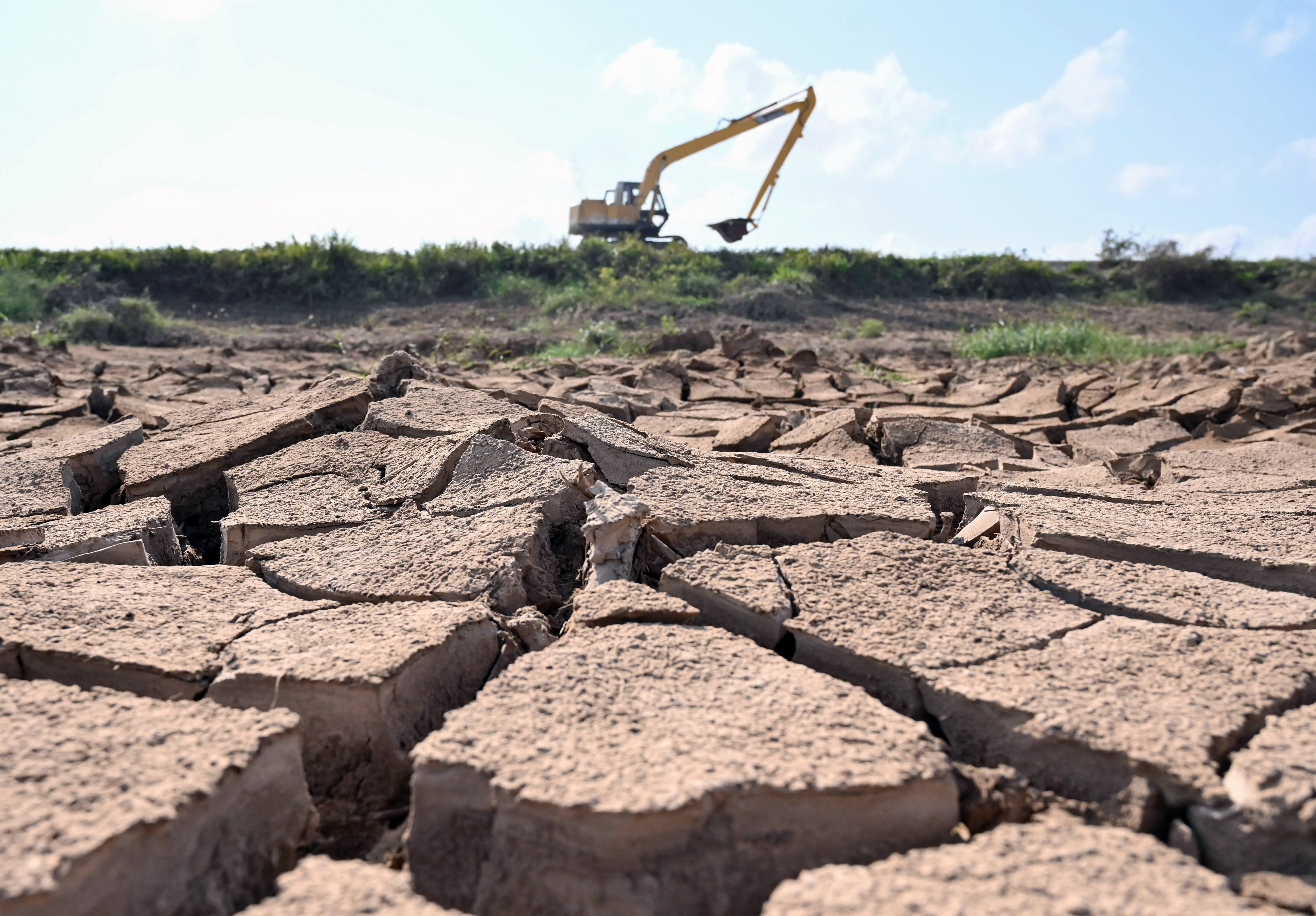 An excavator drives past a dried-up pond in Vietnam’s southern Ben Tre province on March 19, 2024.