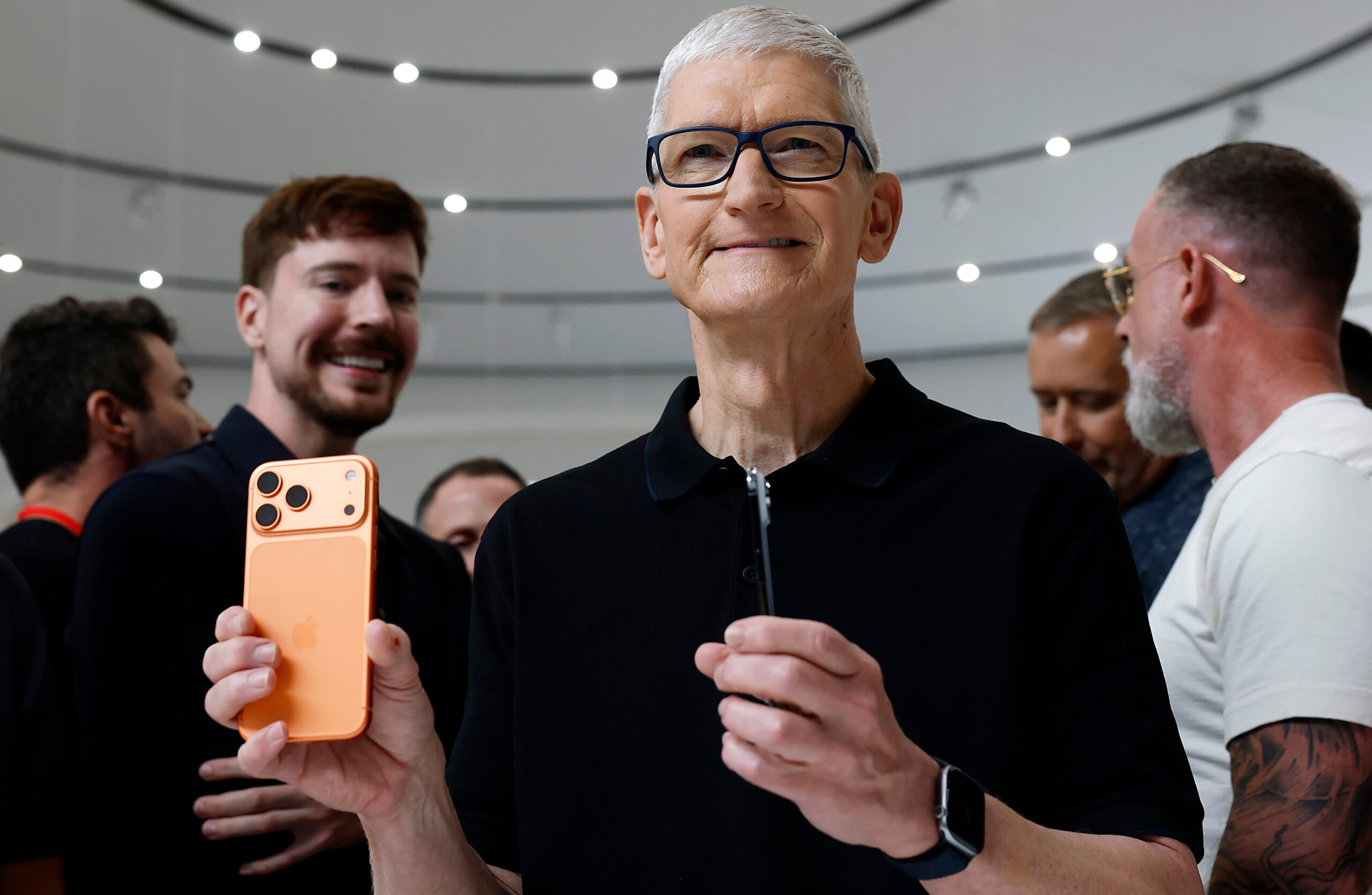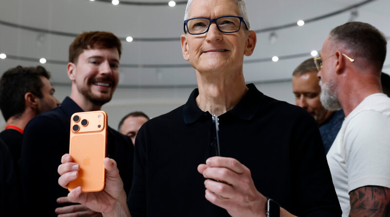 Apple CEO Tim Cook holds a next generation iPhone 17 during an Apple special event at Apple headquarters on September 09, 2025 in Cupertino, California.