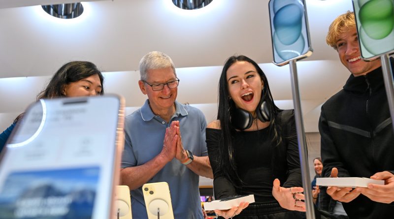Apple CEO Tim Cook greets customers purchasing Apple’s new iPhone 15 during a launch event at the Fifth Avenue Apple Store in New York City on Sept. 22, 2023.
