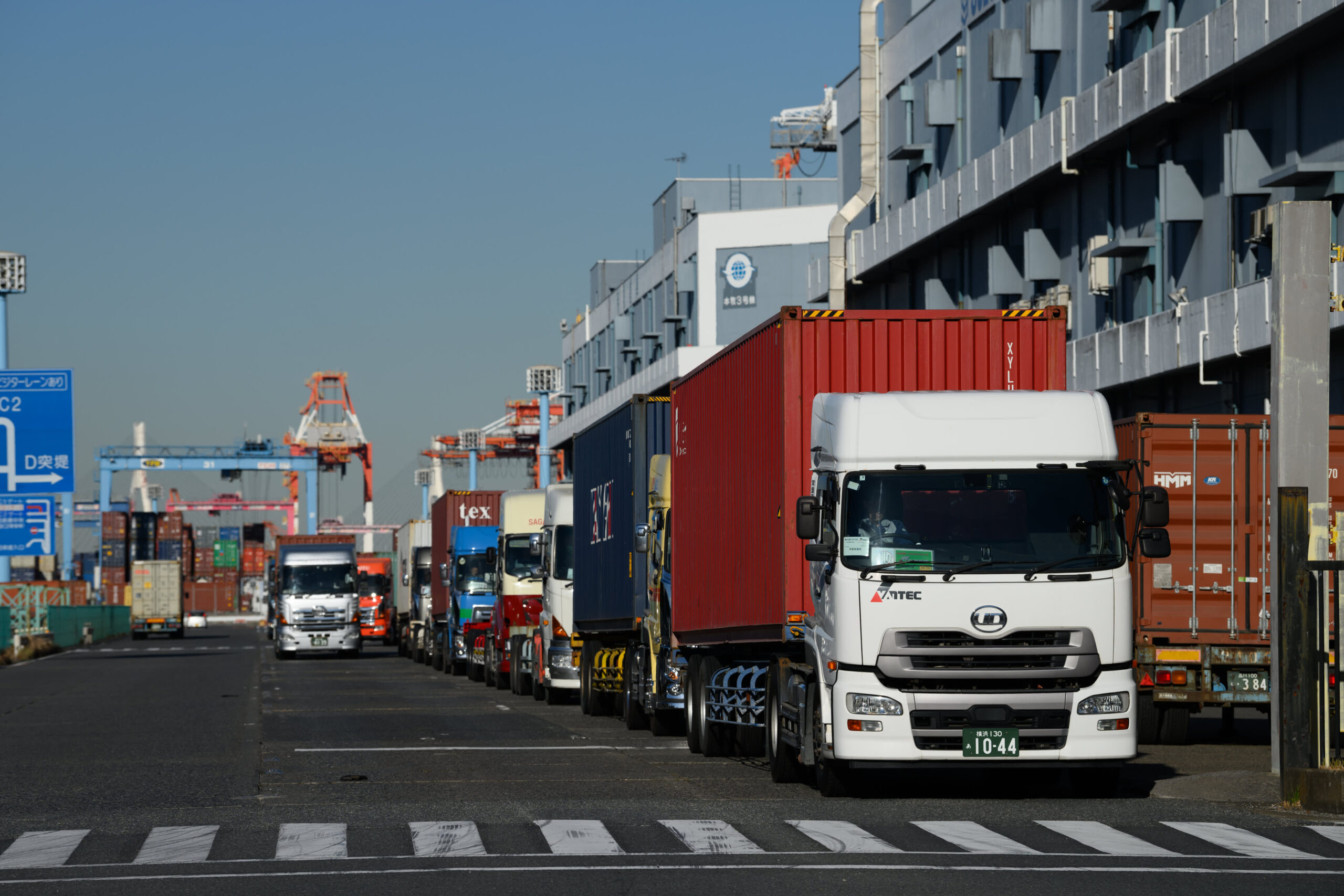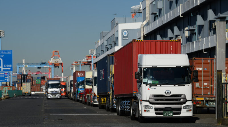 A line of trucks parked outside a shipping terminal in Yokohama, Japan, on Monday, Dec. 4, 2023.