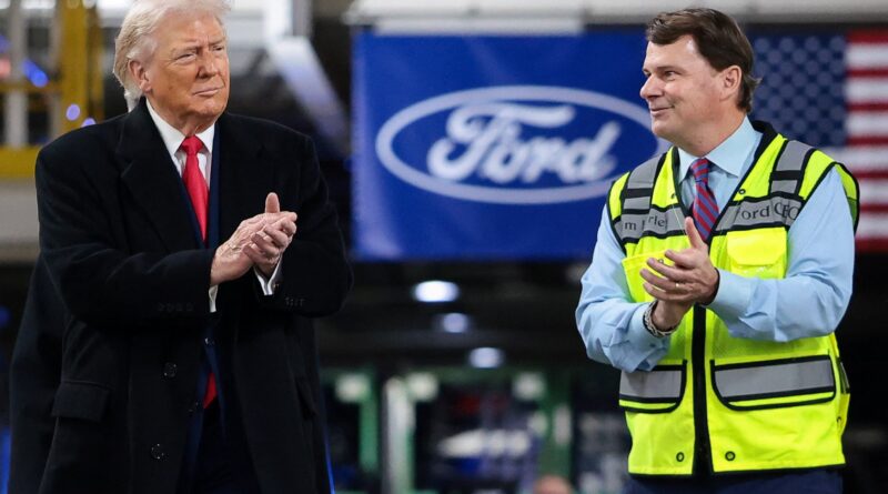 U.S. President Donald Trump and CEO of Ford Jim Farley clap, as President Trump visits a Ford production center, in Dearborn, Michigan, U.S., January 13, 2026.