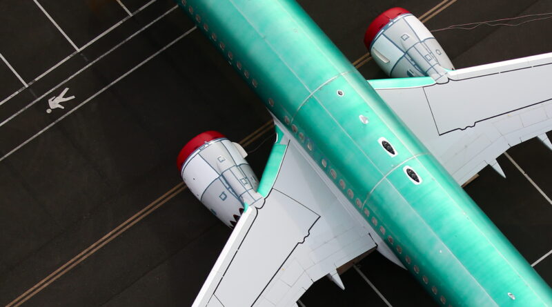 An aerial view of the engines and fuselage of an unpainted Boeing 737 MAX airplane parked in storage at King County International Airport-Boeing Field in Seattle, Washington.