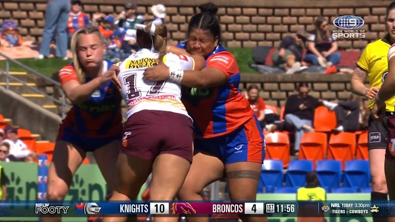 Broncos prop Shalom Sauaso is placed on report after her elbow collects a Knights player in the throat.Source – Theage
