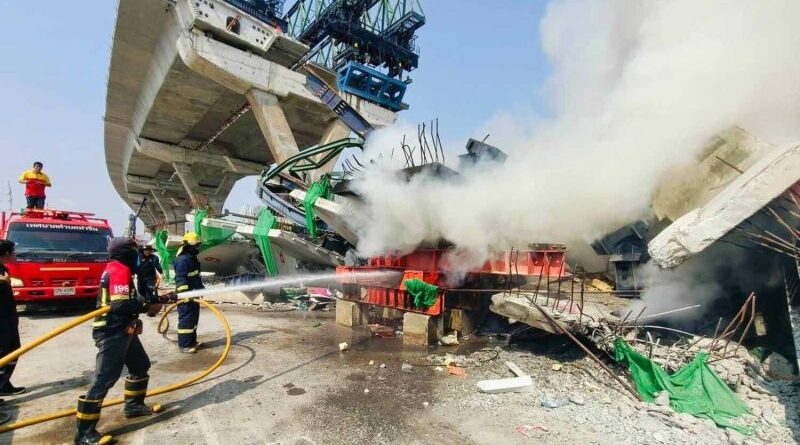 Read moreConstruction giant Italian-Thai in the crosshairs Firefighters douse the blaze at the crane collapse site in Samut Sakhon on Tuesday.