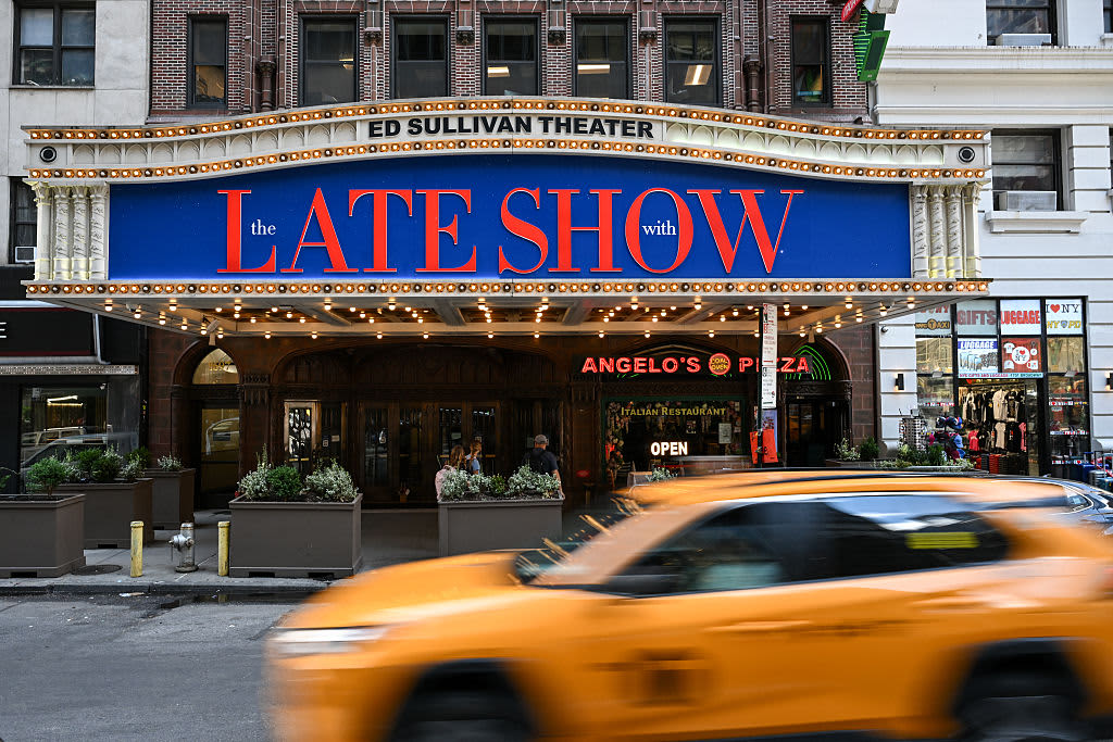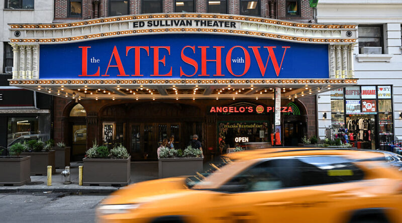 A marquee featuring “The Late Show with Stephen Colbert” is seen outside the Ed Sullivan Theater, where Colbert’s show is produced, in New York City on July 18, 2025.