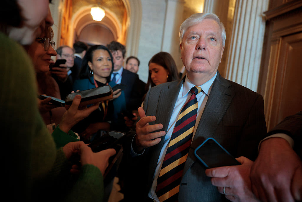 Sen. Lindsey Graham (R-SC) talks to reporters after speaking on the floor of the Senate Chamber at the U.S. Capitol on Jan. 30, 2026 in Washington, DC.