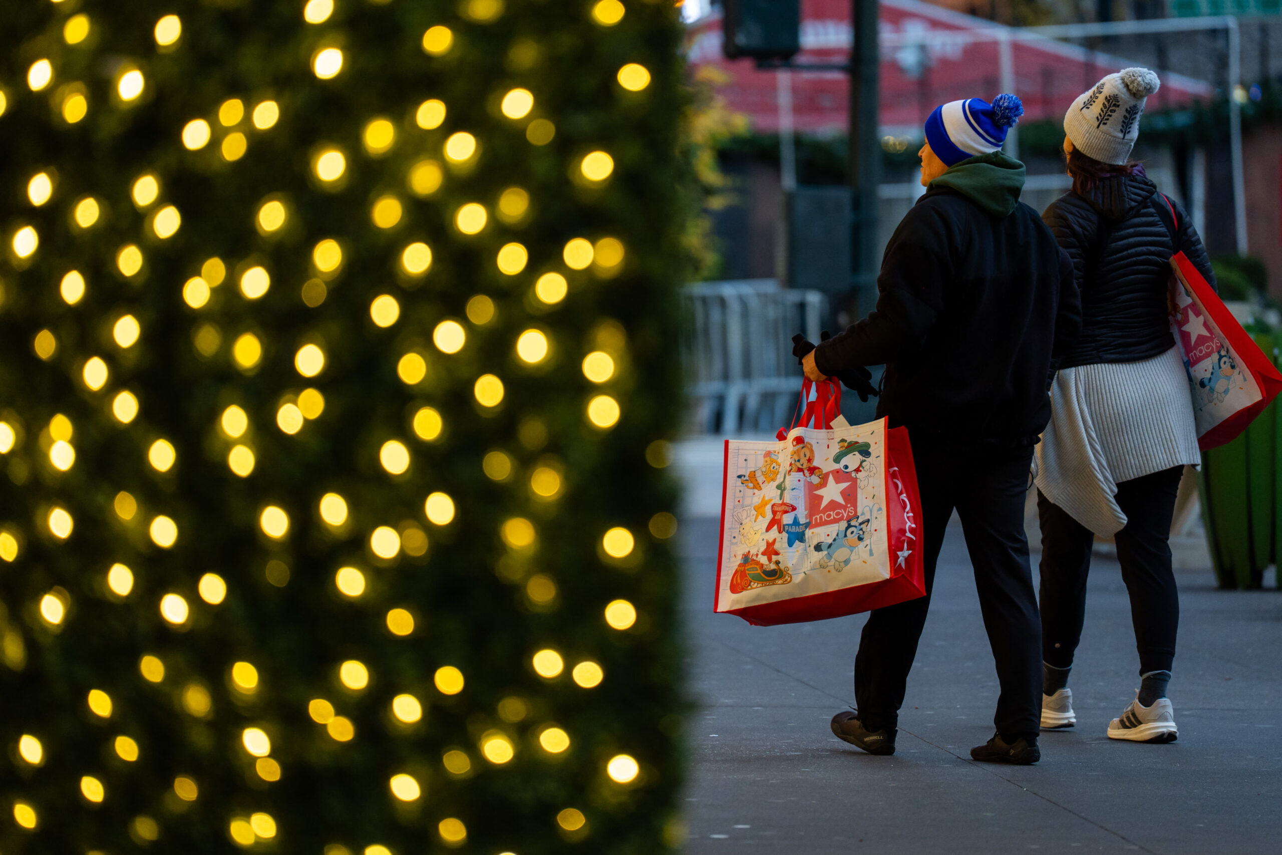 Shoppers carry Macy’s bags outside of Macy’s flagship store on Black Friday in New York, US, on Friday, Nov. 28, 2025.